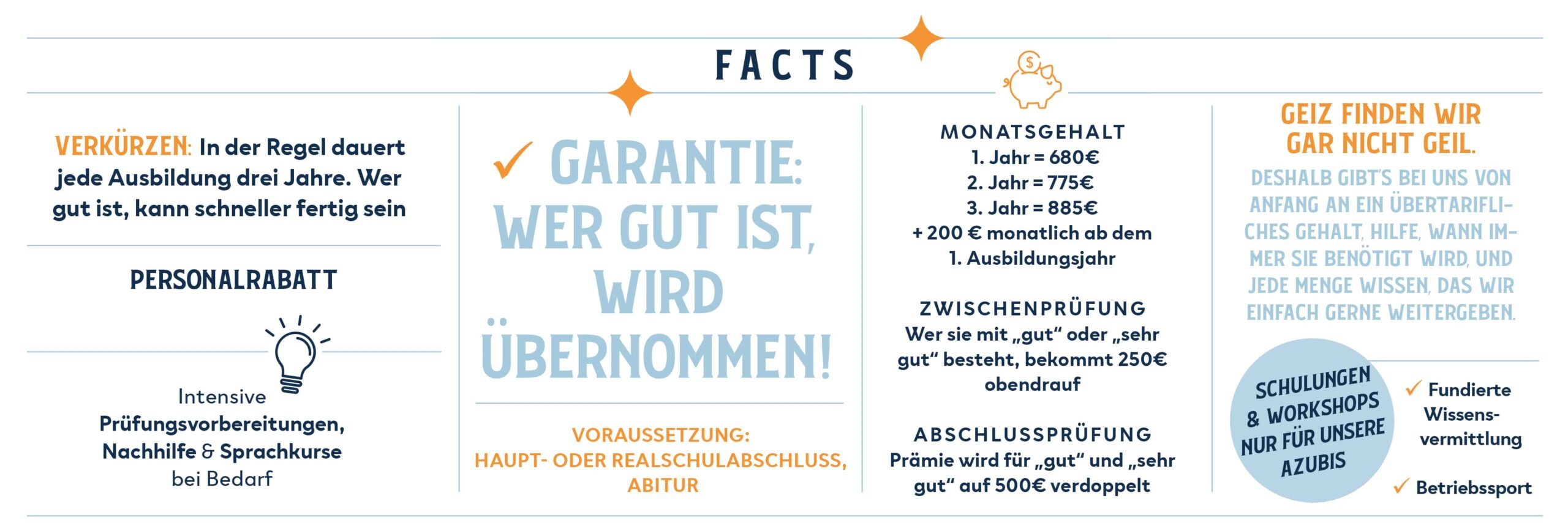 Über gute Noten freuen wir uns, logisch. Aber sie sind bei uns keine Voraussetzung, damit wir unseren Nachwuchs nach den Abschlussprüfungen übernehmen. Eigentlich geben wir jedem eine Chance, wenn Wille, Fleiß und Einsatzbereitschaft da sind. Und wenn du dich nun fragst, was nach der Ausbildung wartet, können wir nur sagen: Jede Menge, denn die Perspektiven sind bei uns so vielseitig wie 220 Puckis.